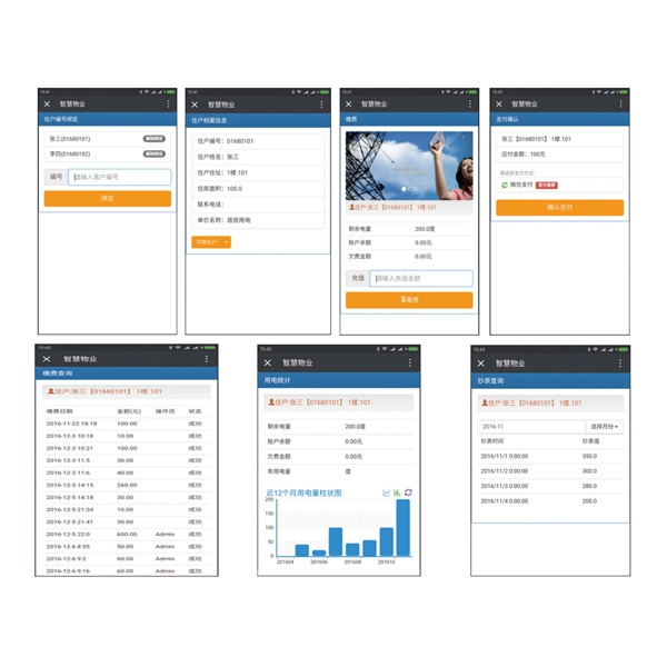 ●实现微信在线自助缴费。 支付方式支付微信支付。查询近6个月的缴费记录。统计显示近12个月的用电量信息。历史抄表记录查询。